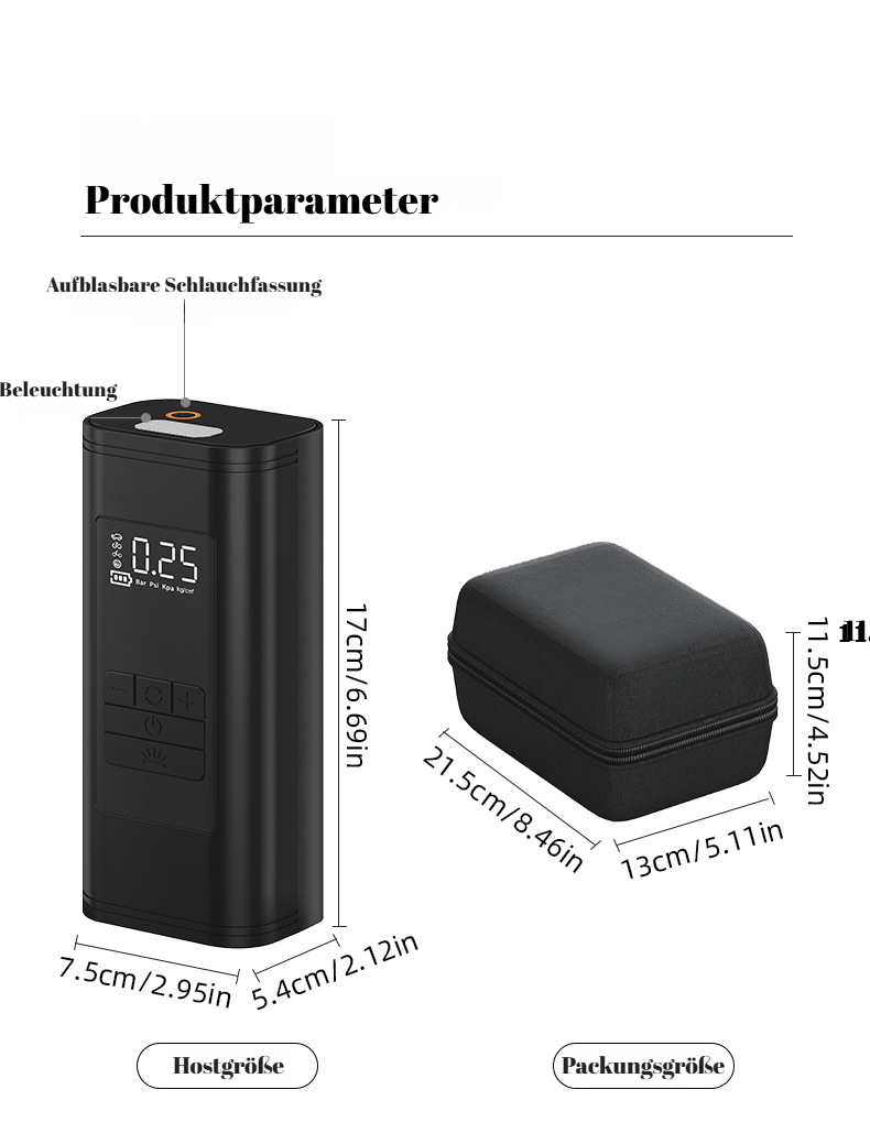 ● All-in-One-Design: Diese Autoluftpumpe vereint Hochspannungskompressor, kabelloses Aufladen und automatische Druckkontrolle in einem kompakten Gerät – ideal für unterwegs. ● Kabellose Freiheit: Dank integriertem Akku können Sie Ihre Reifen überall und jederzeit aufpumpen, ohne auf eine Steckdose angewiesen zu sein – maximale Flexibilität und Komfort. ● Schnelles und sicheres Aufpumpen: Die Hochleistungs-Autoluftpumpe sorgt für einen schnellen Luftdruckaufbau und schaltet sich automatisch ab, sobald der gewünschte Druck erreicht ist – für mehr Sicherheit. ● Vielseitig einsetzbar: Perfekt geeignet für Autoreifen, Fahrräder, Motorräder, Bälle und andere aufblasbare Gegenstände – ein echtes Multitalent für Haushalt und Freizeit.